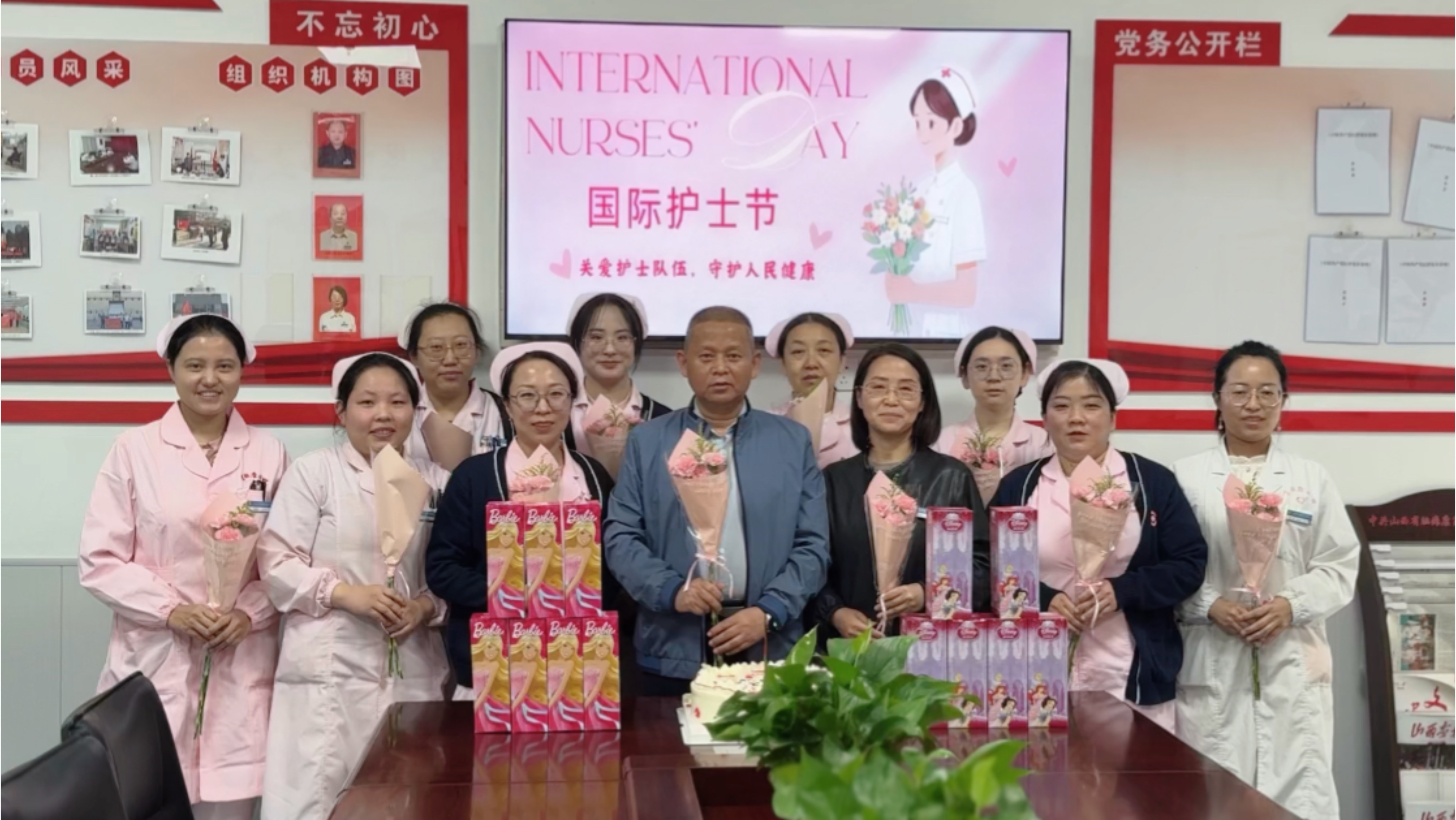 活动尾声,党支部书记沙佳宽和副院长王美荣共同为护士代表献上鲜花,并切开节日蛋糕。芬芳的鲜花与甜蜜的蛋糕承载着医院对护理团队的深切关怀,现场欢声笑语不断。全体人员在“关爱护士队伍 守护人民健康”主题背景板前合影留念,镜头定格下白衣天使们的灿烂笑容,也为座谈会画上温馨句点。